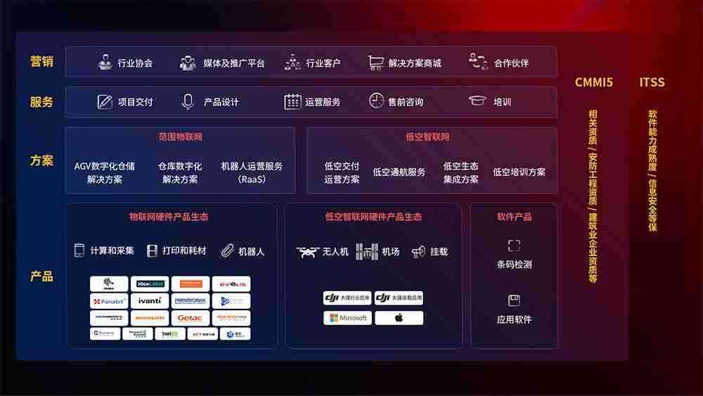 聚合国内外先进的物联网硬件产品品牌,,聚焦数字化仓储、、机器人运营、、、、低空智联网等领域,,,,共同打造适合客户业务场景的解决方案并提供交付服务